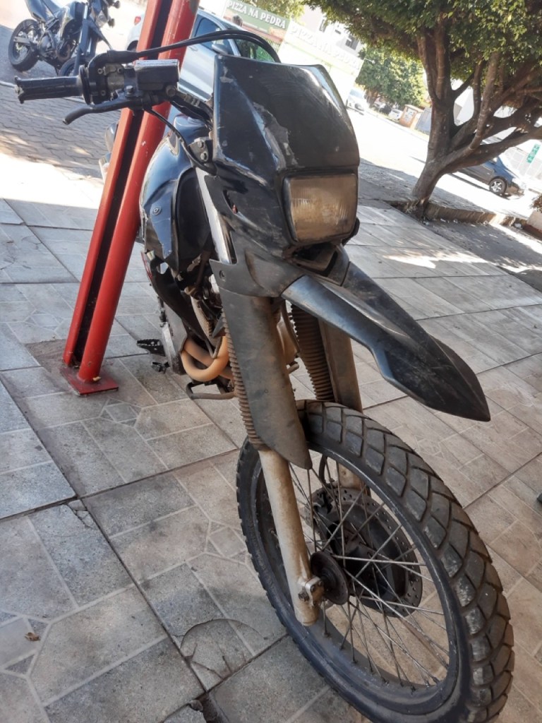 Moto sem retrovisores, guidão empenado, faltando as setas,sem descanso lateral, motor com vazamentos…
